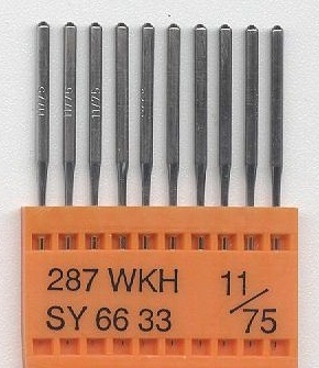 Vyšívacia ihla pre priemyslové stroje -Triumph 287 WKH 11/75 ocelová, s krátkym hrotom (WKH), určená pre vyšívanie materiálov s nerovnomerným povrchom (čapice, koža), doporučená hrúbka nite 120d/2.