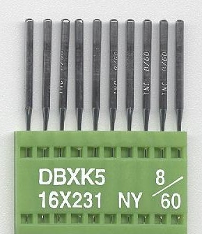 Vyšívacia ihla pre priemyslové stroje -Triumph DBxK5 NY 8/60 ocelová, so špicatým hrotom, určená pre vyšívanie klasických tkaných materiálov, doporučená hrúbka nite 50d/2 alebo 75d/2. Túto ihlu použijeme na malé písmená či jemné kontúry.