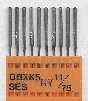 Vyšívacia ihla pre priemyslové stroje -Triumph DBxK5 NY SES 11/75 ocelová, s malým gulatým hrotom (SES), určená pre vyšívanie úpletov, elastických materiálov (riedky úplet) a tričiek, doporučená hrúbka nite 120d/2.