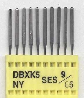 Vyšívacia ihla pre priemyslové stroje -Triumph DBxK5 NY SES 9/65 ocelová, s malým gulatým hrotom (SES), určená pre vyšívanie úpletov, elastických materiálov (riedky úplet) a tričiek, doporučená hrúbka nite 75d/2. Túto ihlu použijeme na menšie písmená či jemnejšie kontúry.