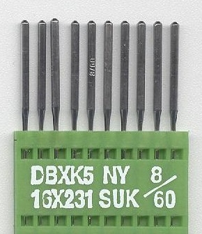 Vyšívacia ihla pre priemyslové stroje -Triumph DBxK5 NY SUK 8/60 ocelová, so stredným gulatým hrotom (SES), určená pre vyšívanie úpletov s väčším priemerom ók, elastických materiálov (riedky úplet), doporučená hrúbka nite 75d/2.